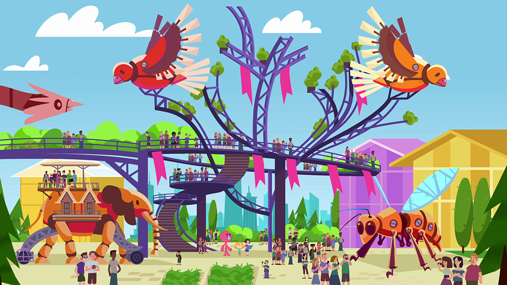В Кубо-городе проходит праздничный Кубо-парад платформ. Участники стараются сделать самую красивую композицию, чтобы побороться за кубок Кубомэра.
