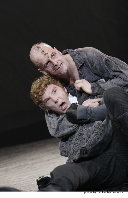 Начало десятых стало в карьере Дэнни Бойла временем экспериментов. Летом 2012 года он показал телеаудитории планеты свое самое грандиозное зрелище – церемонию открытия Лондонской Олимпиады; а за полтора года до этого, зимой 2011-го, триумфально вернулся в театр «Франкенштейном». Собственно, Бойл и начинал карьеру как театральный режиссер: до того, как уйти на телевидение в 1987 году, он поставил несколько спектаклей в «Ройал Корте», и пять – в Королевской Шекспировской компании. Также как церемония открытия Олимпиады, «Франкенштейн» стал триумфом Бойла-концептуалиста. Задействовав в качестве автора сценической адаптации «Франкенштейна» драматурга Ника Дира, режиссер придумал гениальный ход – чередовать Камбербэтча и Ли Миллера на главных ролях создания и доктора. Помимо нешуточного финансового бонуса (дабы получить исчерпывающее представление о спектакле, зрителям надо ходить в театр два вечера подряд!), эта идея несет в себе и революционное художественное измерение. Ежевечерне тасуя человеческое и чудовищное, заставляя актеров постоянно сбрасывать одну шкуру и залезать в другую, Бойл создает уникальный стерео-эффект сценической правды, отменяя ее однозначность и восстанавливая естественное многообразие точек зрения на происходящие события и саму жизнь. Меняясь ролями, Камбербэтч и Ли Миллер демонстрируют высший актерский пилотаж: трудно представить, что кто-то из зрителей, посмотрев один из вариантов спектакля, не захочет прийти и посмотреть второй. Существует мнение, что Ли Миллер-создание – наиболее яркий из двух, а Камбербэтч органичнее в роли доктора, но чтобы согласиться или опровергнуть это утверждение, надо увидеть в каждой из ролей их обоих. Неудивительно, что актеры разделили между собой две главные лондонские театральные награды – премию Лоуренса Оливье и премию газеты Evening Standard. Спектакль уникален и своей сценографией: круглая сцена, построенная дизайнером Марком Тилдесли, придуманный им модернистский реквизит (родовая «плацента», из которой рождается создание, и рассекающий по сцене паровоз) навсегда врезаются в память. Музыку к спектаклю написали постоянные саундтрекеры Бойла, электронный дуэт Underworld, а на второстепенных ролях можно заметить много известных лиц: прежде всего, звезду бондианы Наоми Харрис в роли Элизабет и валлийского ветерана сцены Карла Джонсона в роли слепого Де Лейси.